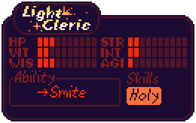 The Light Cleric is a Radiant-aligned Wisdom support caster. Their special ability is Smite, a melee attack which does bonus damage to evil monsters.