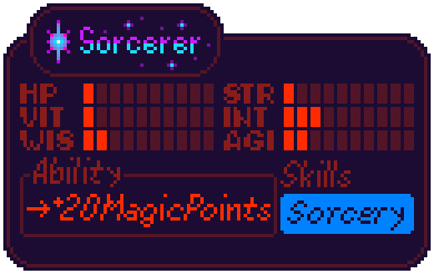The Sorcerer class uses element-neutral magic in combat. They have 20 bonus Magic Points (MP), making them very potent spellcasters. Many Sorcerer skills have chance-based effects, such as having a chance to refund MP or strike multiple times.