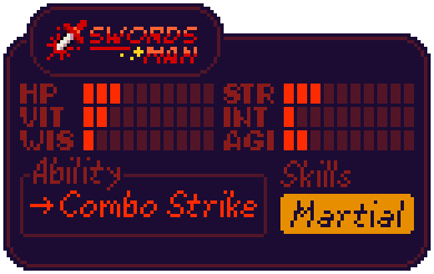 The Swordsman class is a strong physical fighter class. Their special ability is Combo, which is a weak melee attack that can be used for free at the start of your turn.