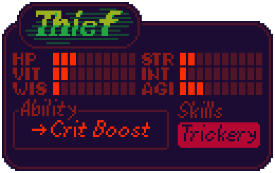 The Thief class utilizes high speed in combat. They can use Sharpen Knives as a Quick Action to vastly increase their Critical Hit chance. They also have the special ability to Steal items from enemy's potential loot table. Some rare items can only be obtained by stealing them!